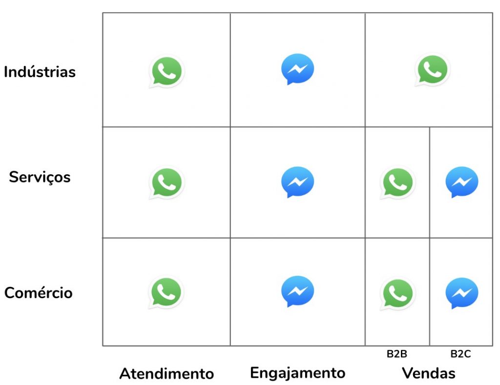 Nessa abordagem, analisei 50 cases de mercado do Facebook (38) e da Take (12) em relação a duas variáveis: objetivo do case (atendimento, engajamento ou vendas) e setor econômico da empresa (indústria, serviços ou comércio). Além disso, foram 25 cases do Messenger e 25 do WhatsApp.