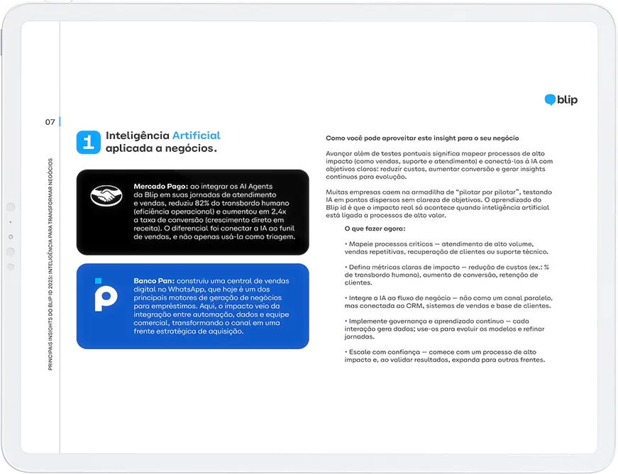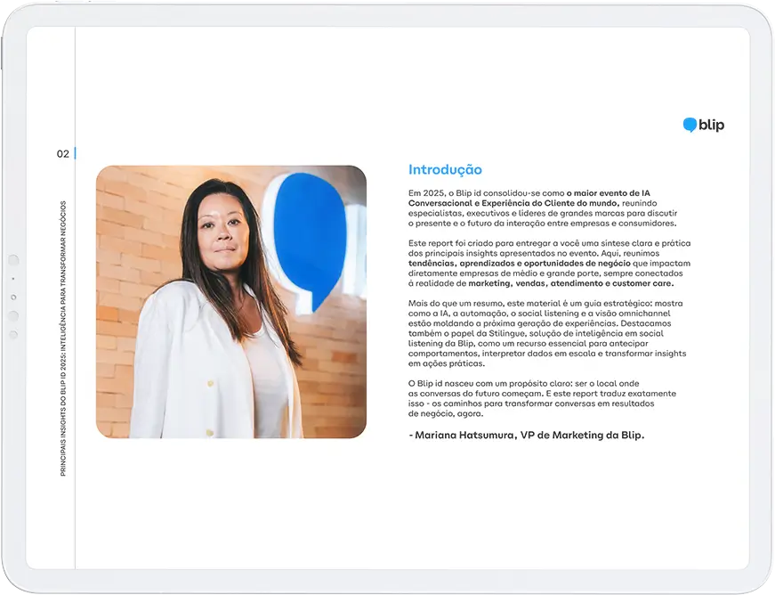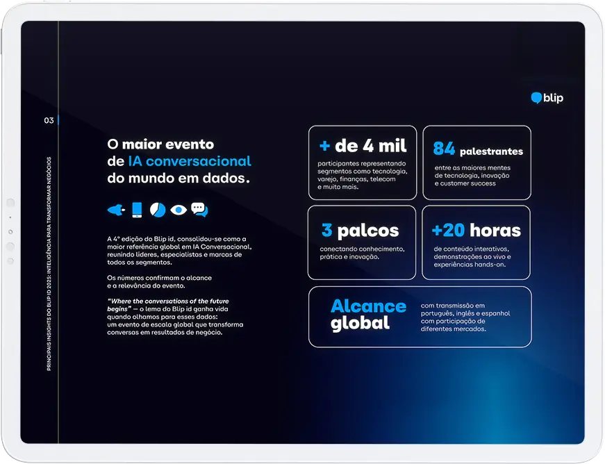 É um report com os principais insights do Blip id 2025, o maior evento global de IA Conversacional. Ele traz tendências, cases e um guia prático para aplicar no seu negócio.