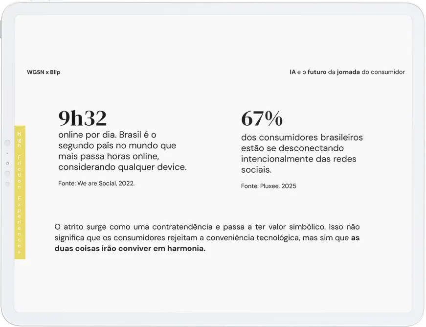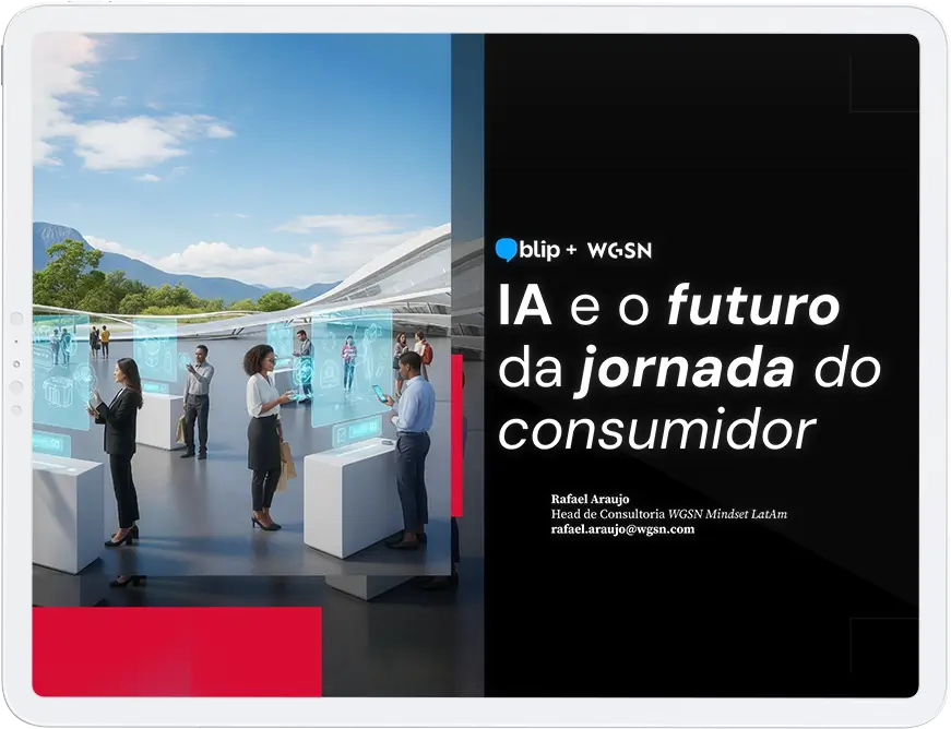 É um report exclusivo produzido pela WGSN em parceria com a Blip, que traz tendências de consumo e tecnologia com foco no impacto da IA na jornada do consumidor.
